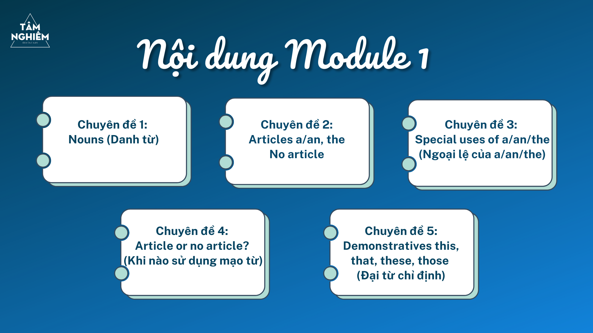 Bạn đang học tiếng Anh trình độ B1-B2 và mong muốn làm chủ ngữ pháp một cách tự tin? Tâm Nghiêm sẽ đồng hành cùng bạn trong hành trình chinh phục chuyên đề Module 1 – Nouns and Articles. Chuyên đề này tập trung vào các kiến thức ngữ pháp nền tảng nhưng vô cùng quan trọng. Hãy chuẩn bị sẵn giấy bút để ghi chú lại ngay!