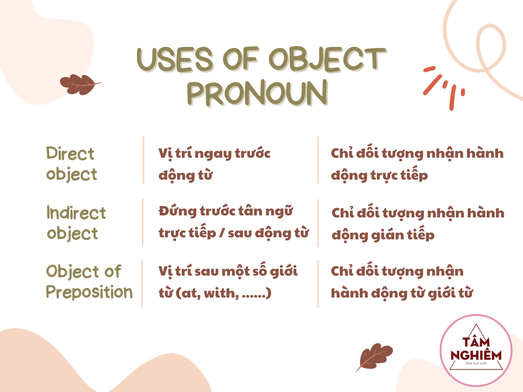 Đại từ tân ngữ (Object Pronoun) là thành phần vô cùng quen thuộc trong ngữ pháp tiếng Anh. Chúng được sử dụng rộng rãi trong cả văn nói và văn viết. Việc nắm rõ cách sử dụng loại đại từ này sẽ giúp câu văn trở nên ngắn gọn, mạch lạc hơn. Vậy đại từ tân ngữ là gì? Chúng được sử dụng như nào? Hãy cùng Tâm Nghiêm theo dõi qua bài viết dưới đây nhé!