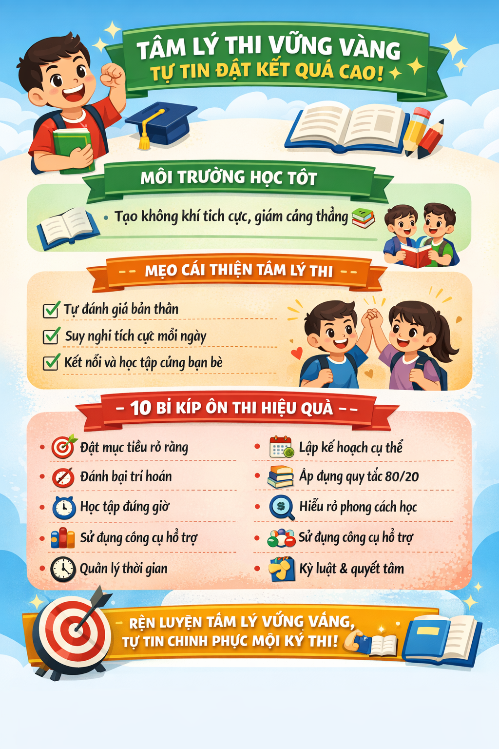 - Chuẩn bị tâm lý thi không chỉ là ôn luyện kiến thức mà còn là rèn luyện tư duy tích cực, tự tin và kỷ luật học tập.