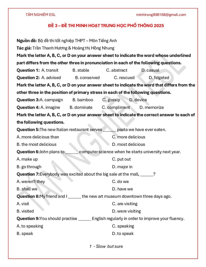Luyện đề thi thử là một phương pháp hiệu quả giúp học sinh THPT củng cố kiến thức, nâng cao kỹ năng làm bài và sẵn sàng cho kỳ thi chính thức. Dưới đây là đề thi tốt nghiệp THPT Tiếng Anh số 02, giúp các em đánh giá năng lực, nhận ra điểm yếu cần khắc phục và cải thiện kết quả. Hãy tận dụng tài liệu này để ôn tập và đạt thành tích cao!