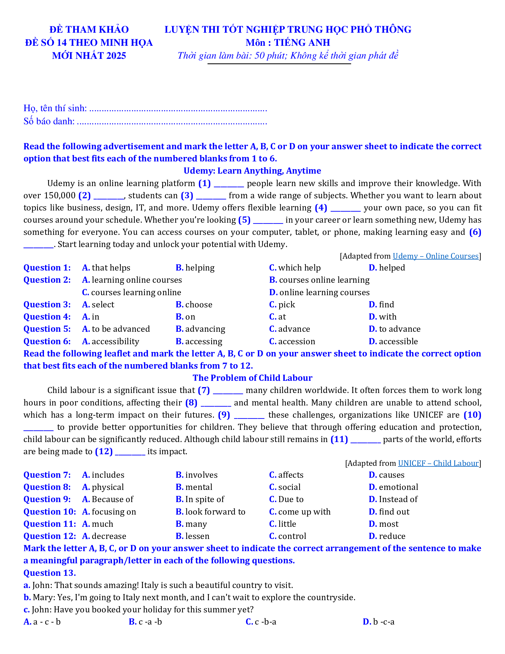 Luyện tập với các đề thi thử là một phương pháp quan trọng giúp học sinh THPT củng cố kiến thức, nâng cao kỹ năng làm bài và chuẩn bị tốt nhất cho kỳ thi chính thức. Đề thi tốt nghiệp THPT Tiếng Anh số 14 dưới đây sẽ giúp các em tự đánh giá năng lực và cải thiện điểm số. Hãy tận dụng tài liệu do Tâm Nghiêm cung cấp để ôn tập hiệu quả và đạt kết quả cao nhất!