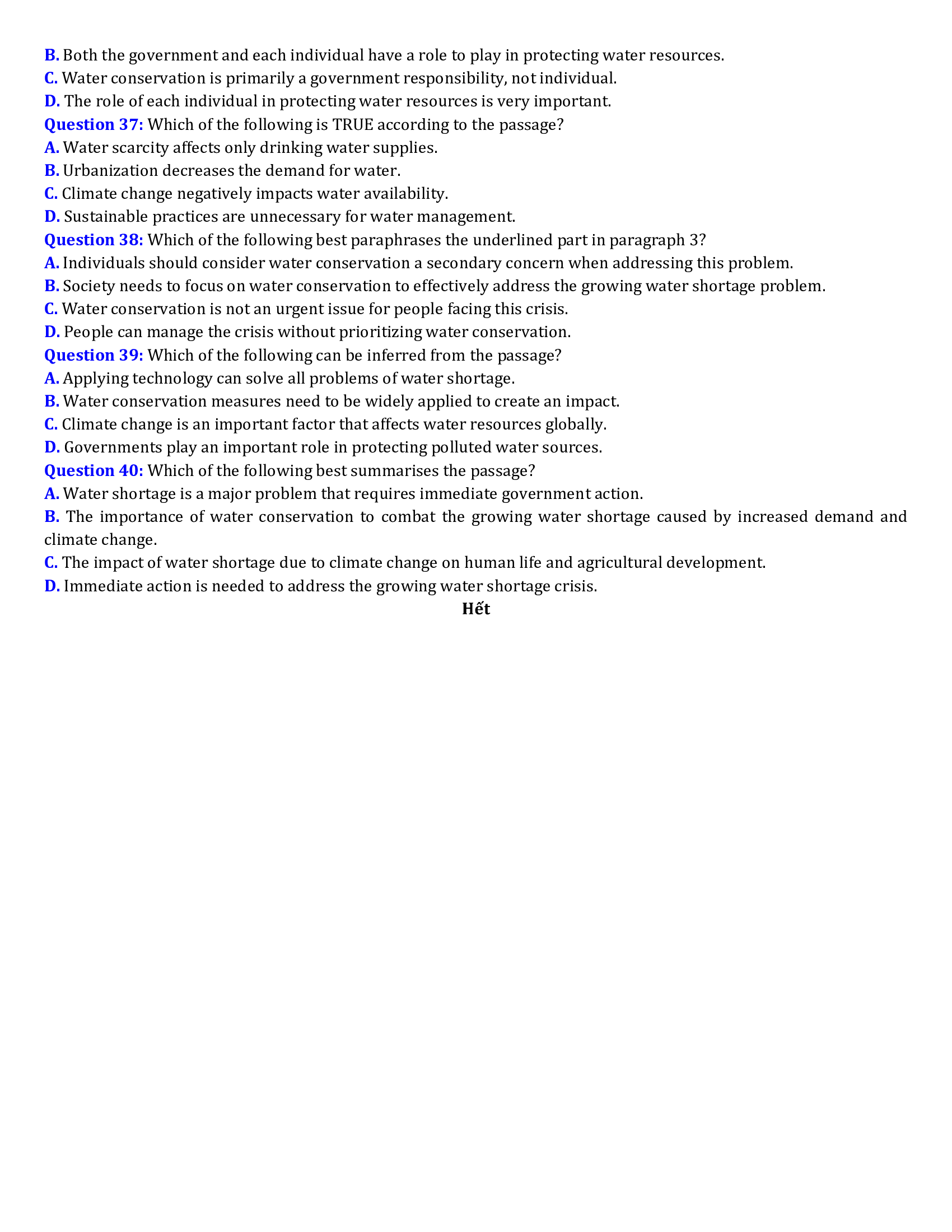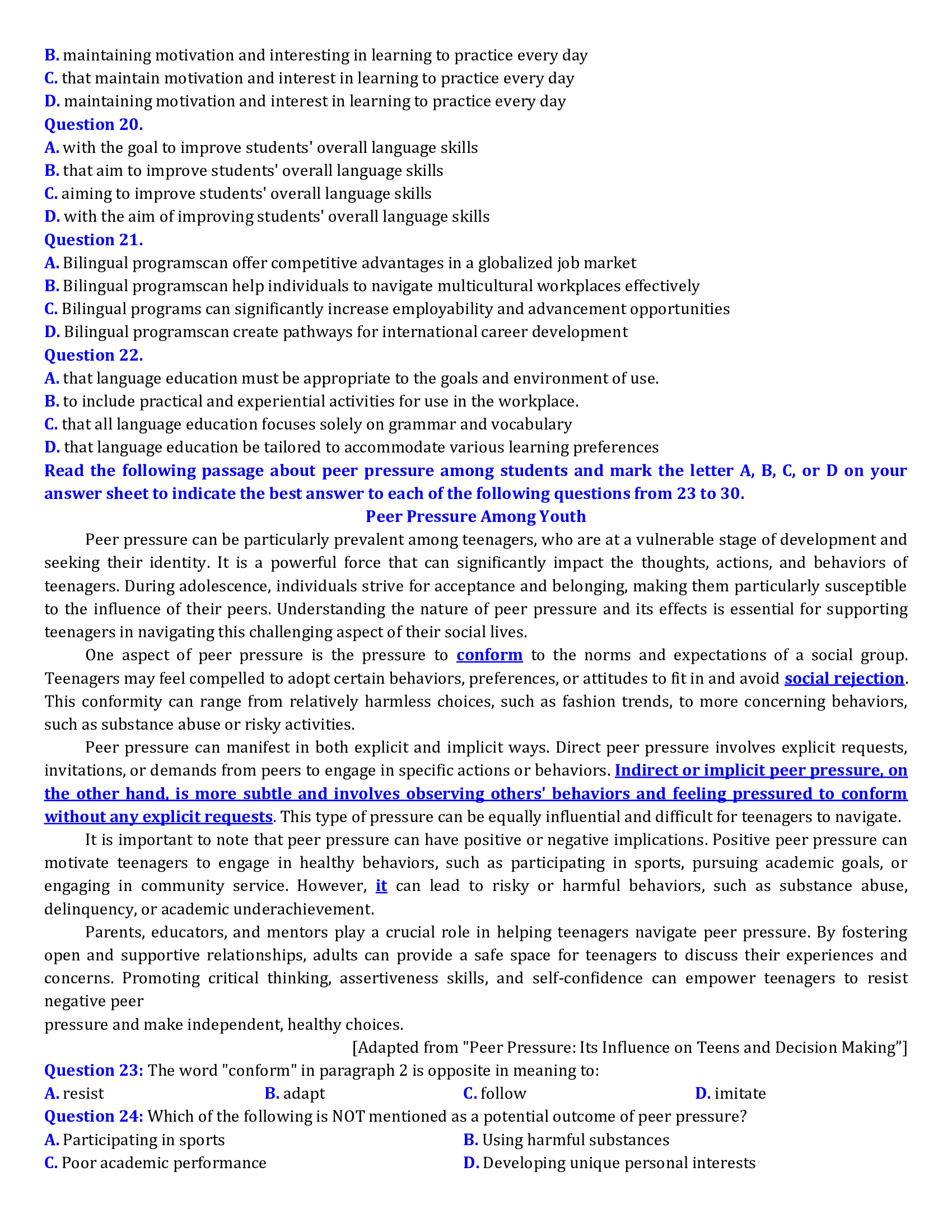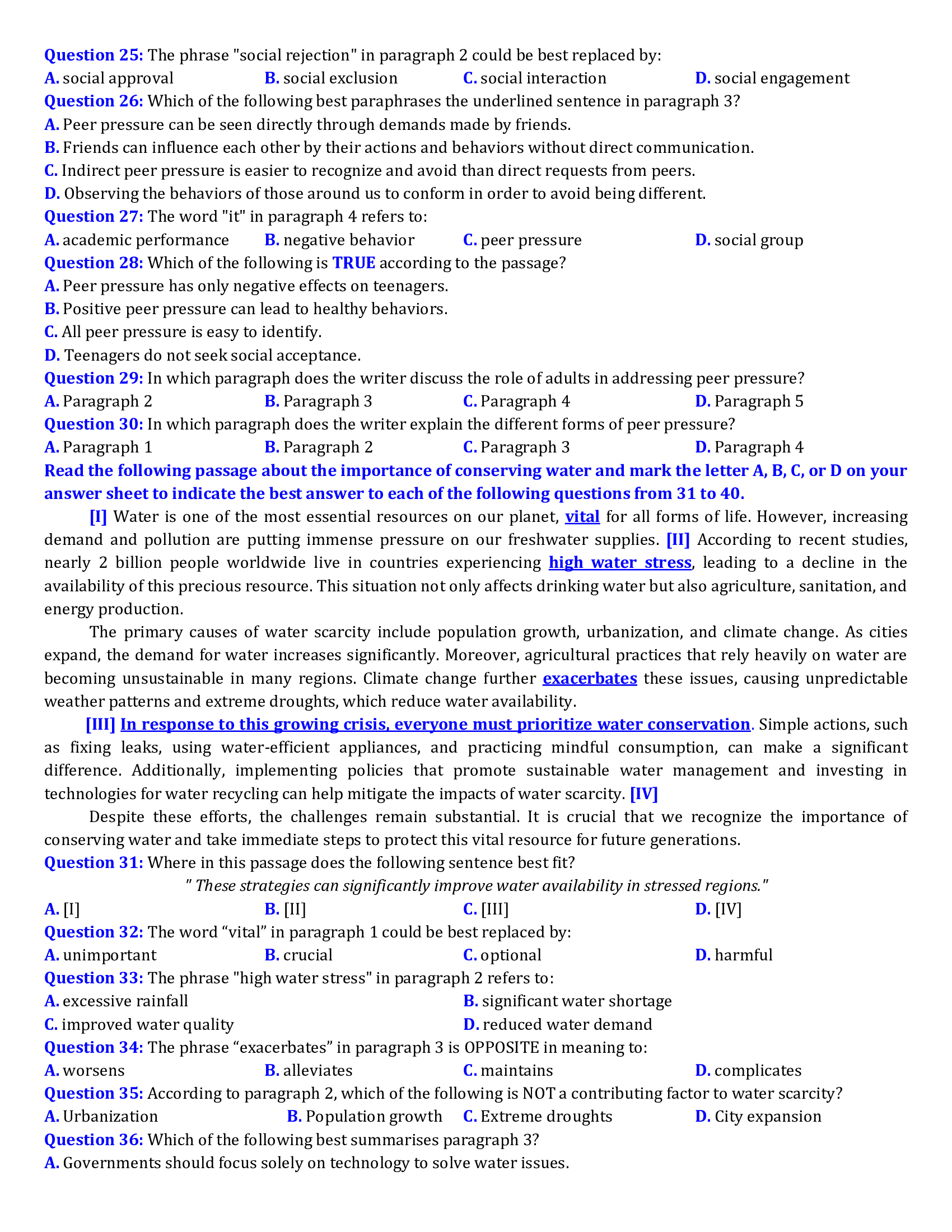 - Tìm ý chính (Main idea): Các đoạn văn thường tập trung vào những tác động như peer pressure on teenagers, the importance of water conservation.