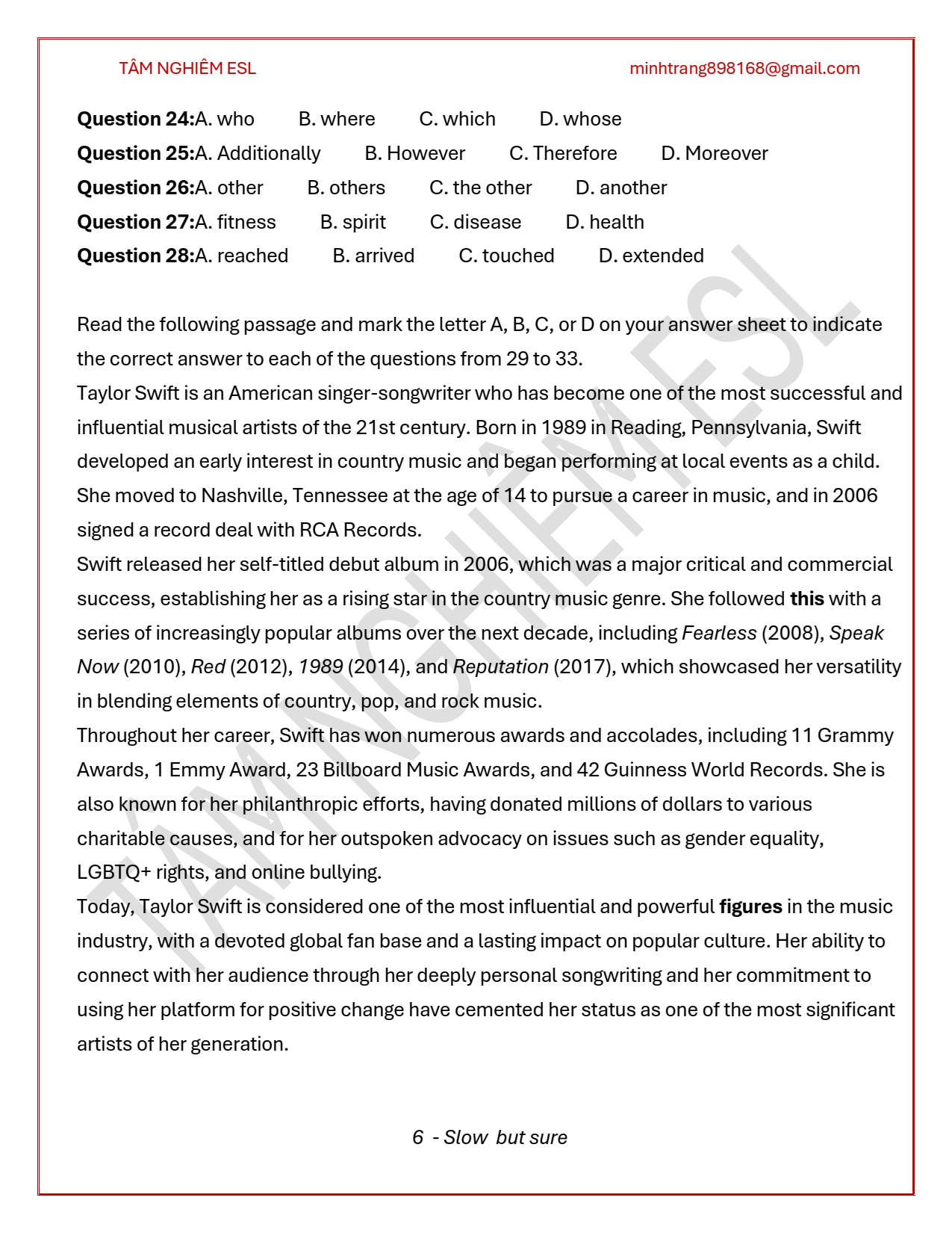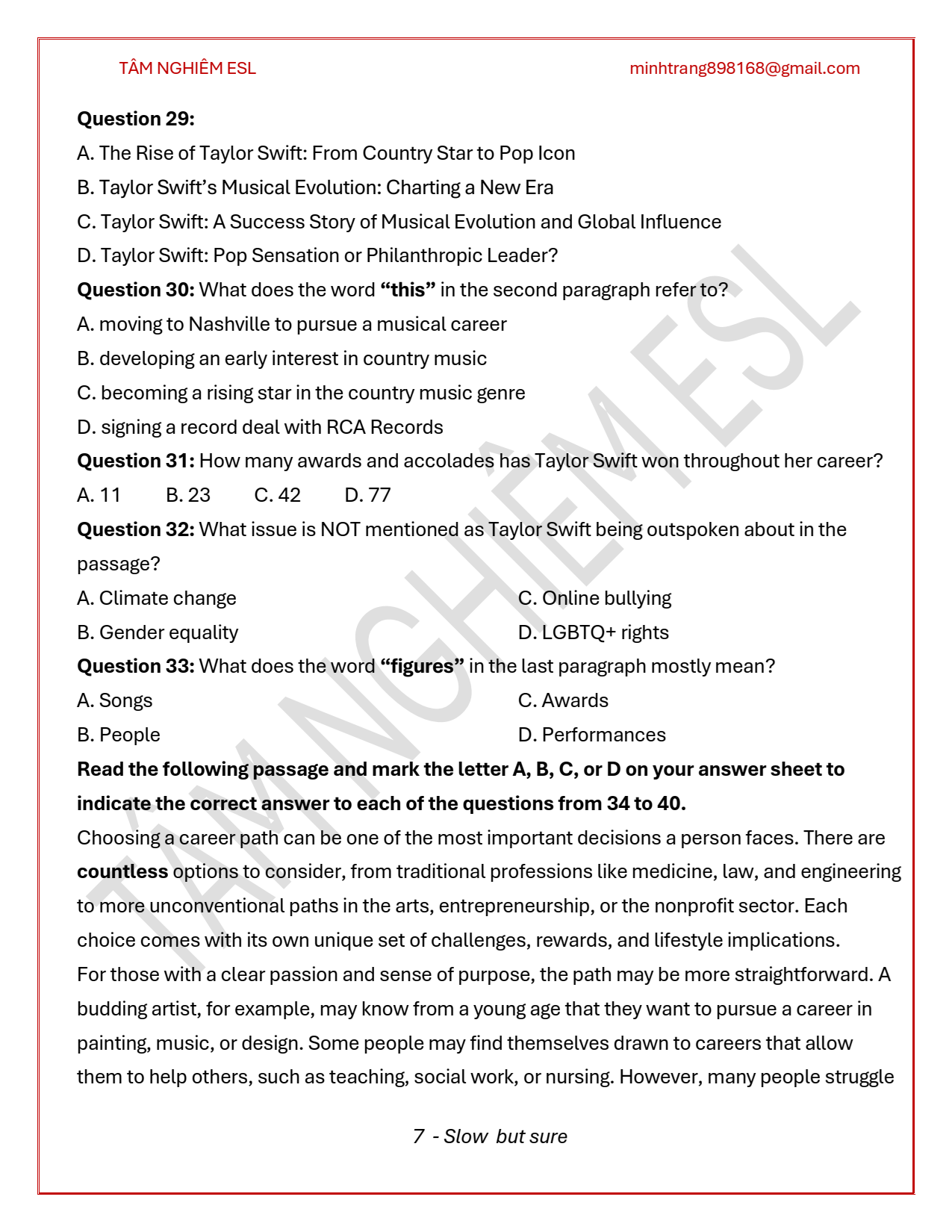 • Từ vựng và chủ đề xoay quanh đời sống, giáo dục, môi trường, khoa học, nghệ thuật, nhân vật nổi tiếng (ví dụ: Taylor Swift), rất gần với chương trình THPT mới.