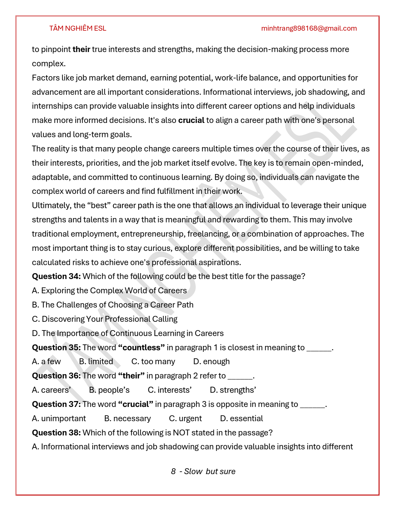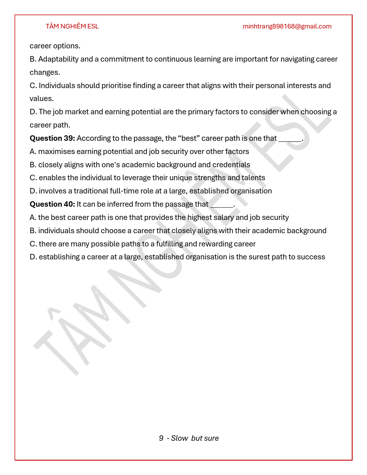 •  Bài nói tổng quát về nhiều lựa chọn nghề, khó khăn, thay đổi nghề → tiêu đề A bao quát nhất.