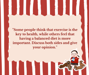 Essay: “Some people think that exercise is the key to health, while others feel that having a balanced diet is more important. Discuss both sides and give your opinion.”.