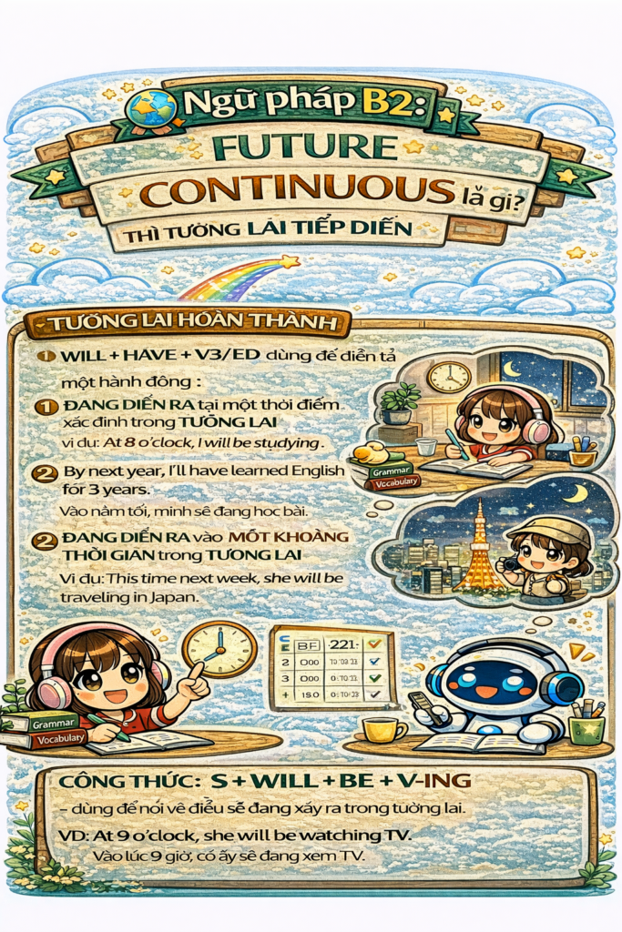 Theo định hướng của chương trình global success, việc học thì tương lai tiếp diễn không chỉ dừng lại ở mức nhận biết cấu trúc mà cần giúp học sinh hiểu giá trị ngữ nghĩa, sắc thái giao tiếp và tính ứng dụng học thuật. Bài viết này mở rộng kiến thức sơ đẳng trong tài liệu, cung cấp phân tích chuyên sâu, ví dụ phong phú và hội thoại minh họa, phục vụ hiệu quả cho giảng dạy và học tập trong global success.