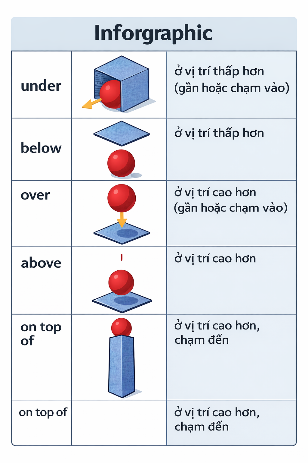 | under | thấp hơn, có thể chạm | Shoes under the bed |