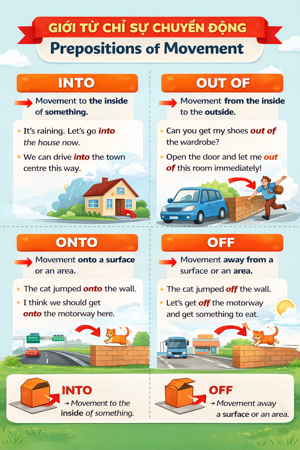 INTO – OUT OF – ONTO – OFF