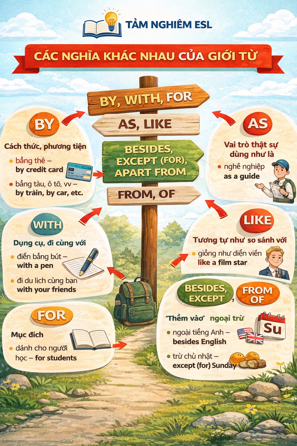 Các giới từ by, with, for, as, like, besides, except, apart from, from, of tuy quen thuộc nhưng lại mang nhiều nghĩa khác nhau tùy ngữ cảnh. Việc hiểu sâu ngữ nghĩa – ngữ dụng của chúng giúp người học không chỉ nói đúng mà còn nói hay, viết chuẩn và tư duy bằng tiếng Anh.