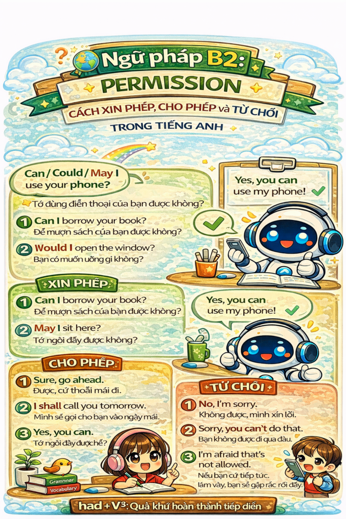 Trong quá trình dạy và học tiếng Anh ở bậc trung học cơ sở và trung học phổ thông, đặc biệt theo định hướng của chương trình global success, việc sử dụng đúng các cấu trúc xin phép (asking for permission), cho phép (giving permission) và từ chối (refusing permission) giữ vai trò vô cùng quan trọng. Đây không chỉ là kiến thức ngữ pháp nền tảng mà còn là kỹ năng giao tiếp mang tính xã hội, văn hóa và học thuật, gắn liền với chuẩn năng lực B2–C1.