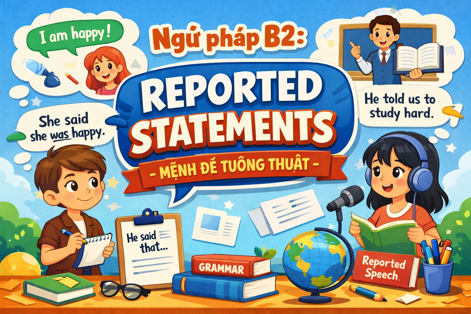 Trong chương trình Global Success dành cho học sinh THCS và THPT, Reported Statements (mệnh đề tường thuật) là chủ điểm ngữ pháp quan trọng ở trình độ B2, xuất hiện thường xuyên trong viết học thuật, viết lại câu, đọc hiểu và kỹ năng nói. Nếu không nắm vững quy tắc chuyển thì, đổi đại từ và trạng từ, học sinh dễ mắc lỗi ngữ pháp và khó đạt chuẩn B2–C1 của chương trình.