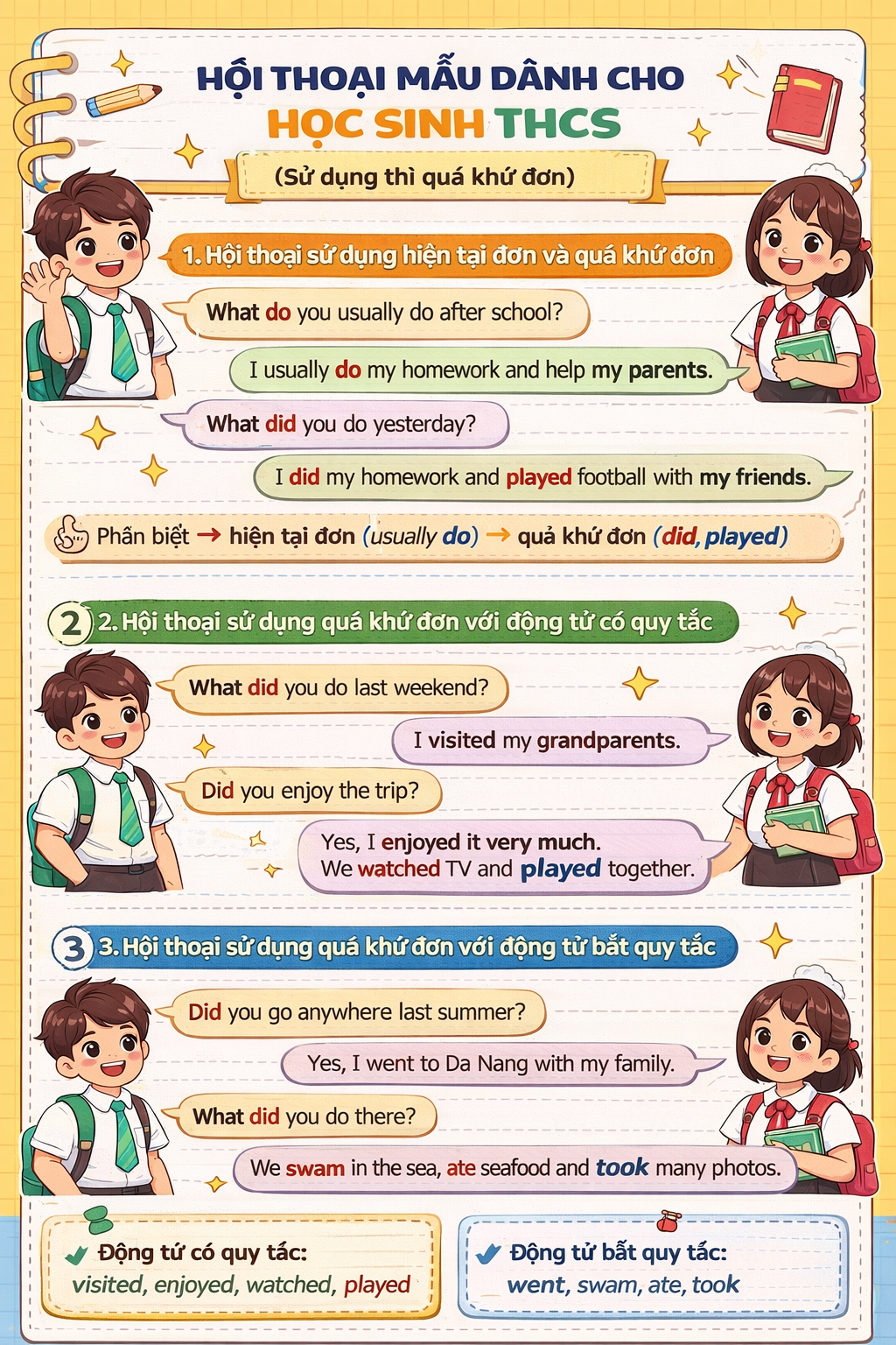 👉 Đoạn hội thoại này giúp học sinh THCS phân biệt hiện tại đơn (usually do) và quá khứ đơn (did, played).