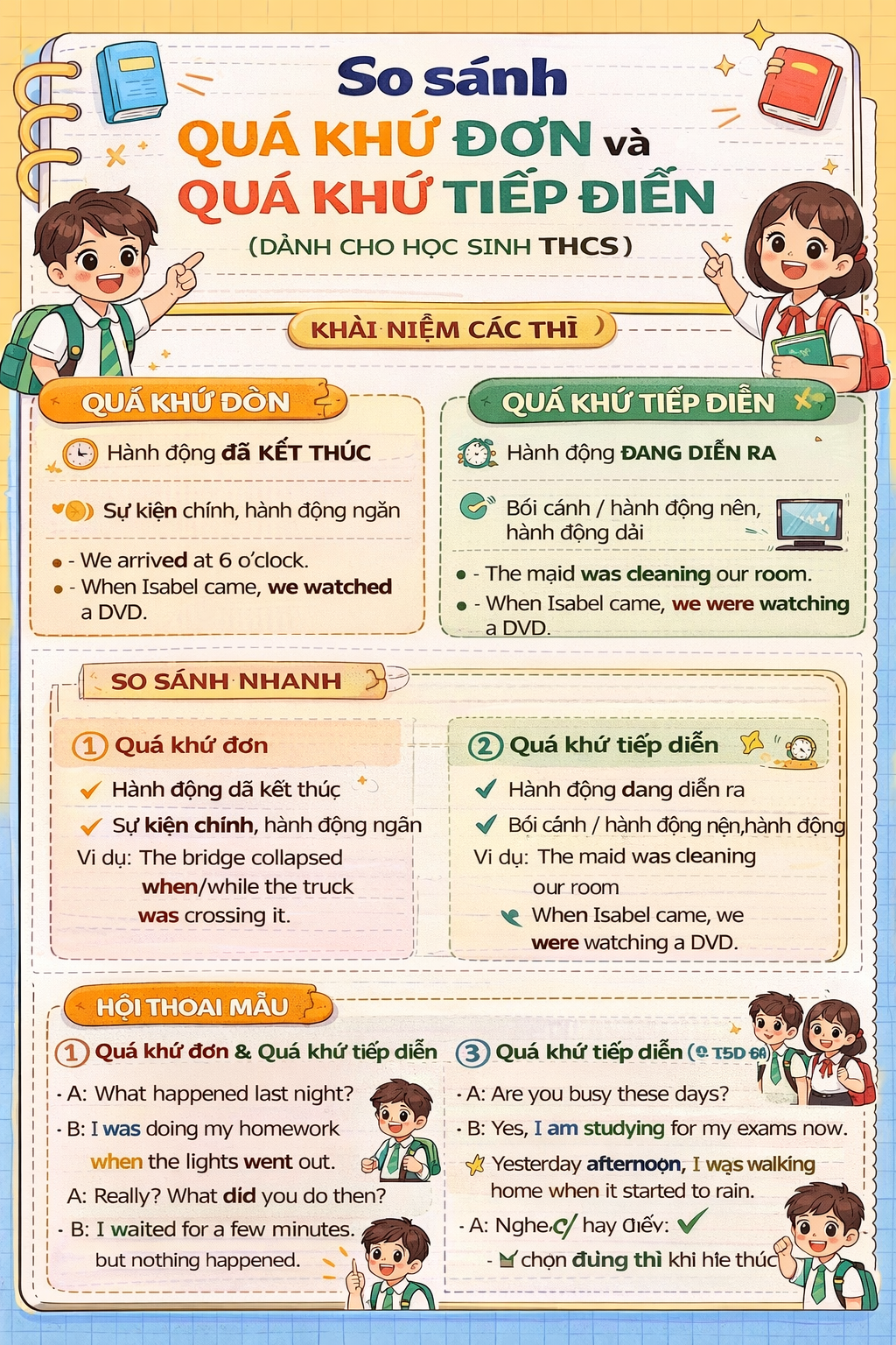 Trong chương trình tiếng Anh THCS, việc phân biệt thì quá khứ đơn (Past Simple) và thì quá khứ tiếp diễn (Past Continuous) là một trong những nội dung quan trọng nhưng cũng gây nhiều khó khăn cho học sinh. Hai thì này đều dùng để nói về quá khứ, tuy nhiên mục đích sử dụng, ý nghĩa thời gian và cách kết hợp trong câu lại hoàn toàn khác nhau. Nếu học sinh THCS chỉ học thuộc công thức mà không hiểu bản chất, các em rất dễ nhầm lẫn khi làm bài tập hoặc viết đoạn văn.