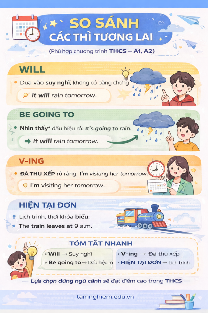 Trong quá trình giảng dạy tiếng Anh ở bậc THCS, một trong những khó khăn lớn nhất của học sinh là phân biệt và sử dụng đúng các thì tương lai. Ở trình độ A1–A2, học sinh thường được giới thiệu nhiều cấu trúc cùng diễn đạt ý nghĩa tương lai như will, be going to, hiện tại tiếp diễn và hiện tại đơn. Tuy nhiên, nếu không được so sánh và hệ thống hóa, các em dễ sử dụng máy móc hoặc nhầm lẫn ngữ cảnh.